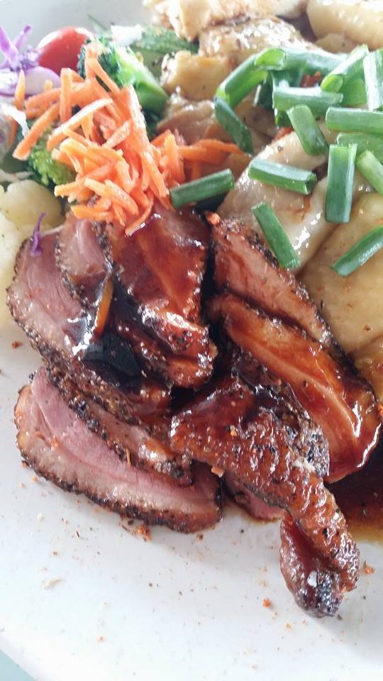 这里还有西式的黑胡椒熏鸭胸,李老板把炮制好的熏鸭用刀片出4厘米薄片,鸭皮上布满黑胡椒碎和香料,夹一块配搭几种清新爽口的蔬菜,再淋上他特调提味的酱汁一起来吃,特别开胃。想吃得健康,您大可跟李老板要上一份糙米饭。